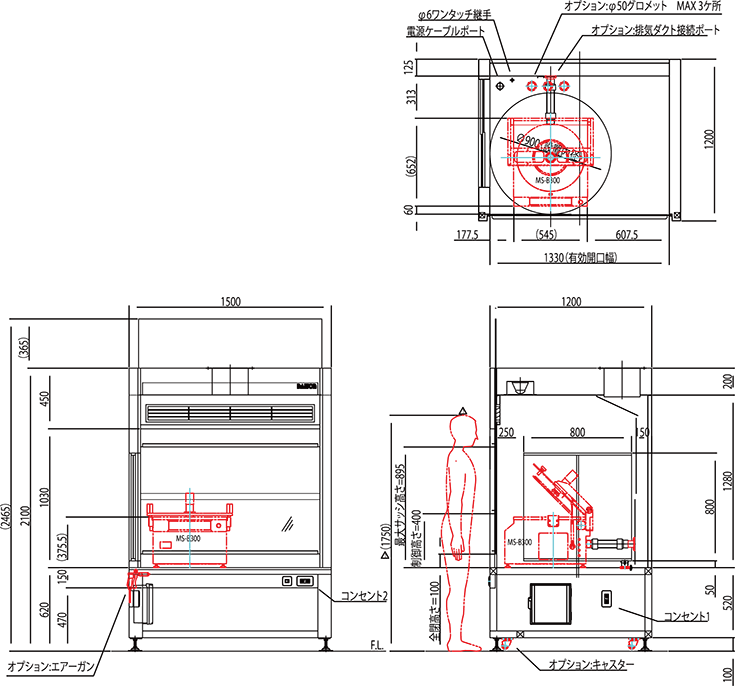 | 外径寸法 | 1500W×1200D×2100H(㎜) 前面扉開時2465H(㎜) |